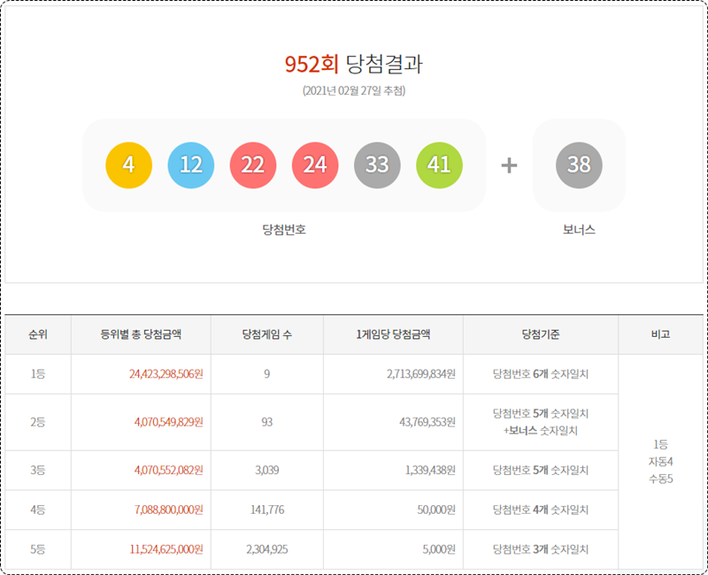 계속해서 당첨금액은 지난주 보다 1등 당첨분이 적어서 그런지 27억 원이라는 큰 금액을 9분께서 나눠 가지시게 되었으며,