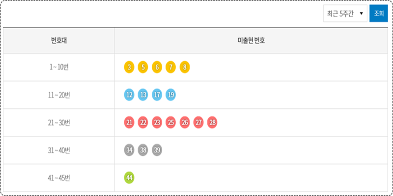 제가 말씀드린 숫자 외에, 위에 이미지에서 보실 수 있는 5주간 미출현 번호 분석을 하셔서 번호를 선택하셔도 좋고,
